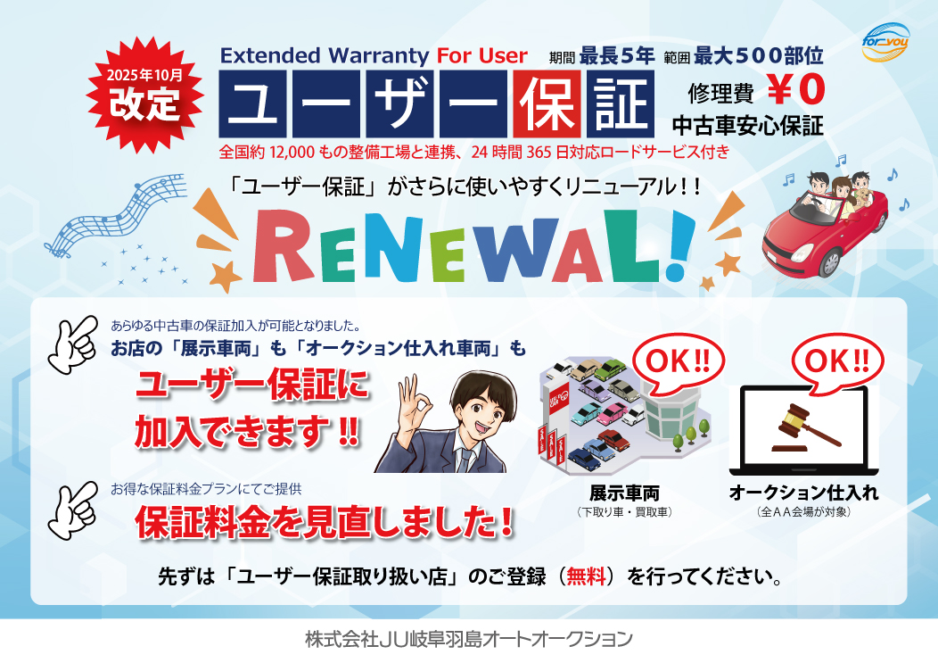 販売店(以下「甲」という)は株式会社JU岐阜羽島オートオークション(以下「乙」という)がニッポンメンテナンスシステム株式会社(以下「丙」という)と共同企画のもと開発した「ユーザー保証」(以下「本保証」という)に関し、甲が締結する販売店契約(以下「本契約」という)の契約条件は本規約に定める通りとする。